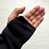 首からの 冷気の侵入を防ぐハイネック部分はドローコードで調整可能。袖はサムホール仕様。