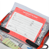 その他にも自分自身がケガなどで動けなくなった緊急時に、他者に自身の緊急連絡先や血液型など、処置に必要な情報を伝えられる防水のIDシートと、バッグの内側にジッパー付きポケットと、フラップ式ポケットがあり、すぐに取り出したいものや、かさのあるものを入れるのに便利です。